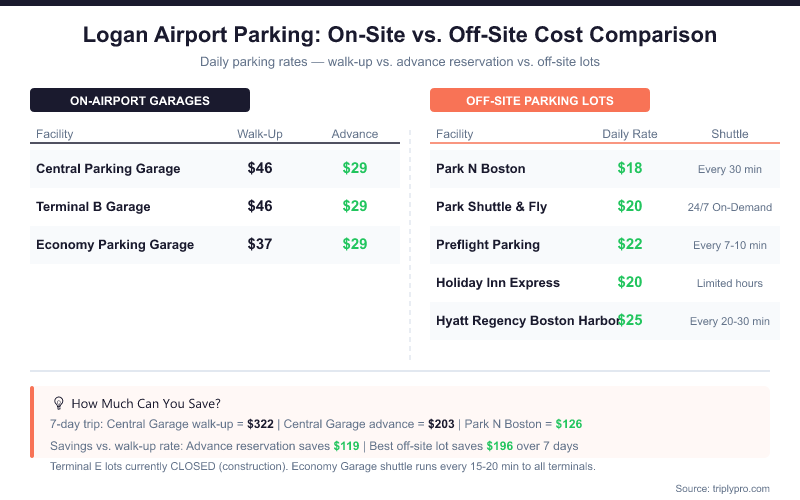 Logan Airport general parking includes the Central Garage ($46/day), Terminal B Garage ($46/day), and Economy Garage ($37/day). Advance reservations drop rates to $29/day. Off-site lots start at $18/day.