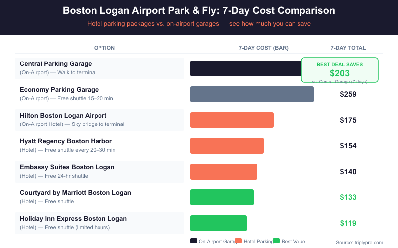 Hotel parking packages at Boston Logan save most travelers 35–60% compared to parking in Logan's own garages. Here's how the numbers break down for a 7-day trip, based on current 2026 rates.