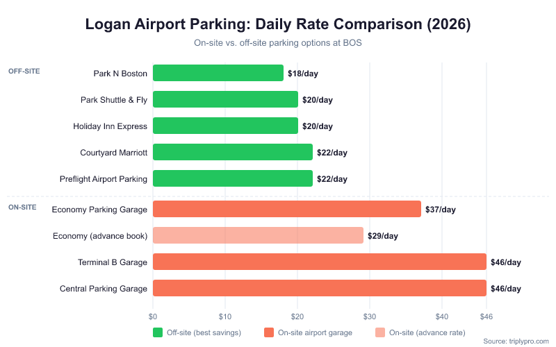 Logan airport parking costs vary widely depending on whether you park on-site or off-site. On-airport rates run from $37/day at the Economy Parking Garage to $46/day at the Central Parking Garage, per Massport's current published rates (verified April 2026). Off-site lots near Logan start at $18/day — that's a savings of up to 61% compared to the Central Garage.
