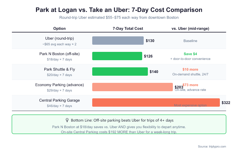 - From downtown Boston: Uber or Lyft typically runs $25-$45 each way. A round trip costs $50-$90. Seven days of off-site parking at $18/day totals $126 — rideshare wins for very short trips, parking wins for anything longer than 2-3 days.