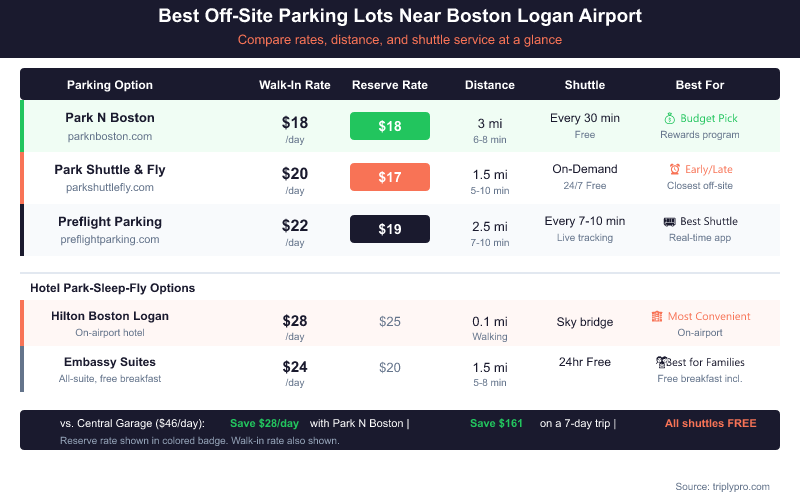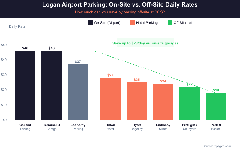 Off-site parking at Logan runs $18–$28/day across nine verified lots. On-site garages charge up to $46/day at the Central Parking Garage and $37/day at the Economy Parking Garage. The savings add up fast on multi-day trips.
