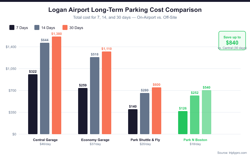 Off-site lots near Logan run $18–$28/day, depending on the facility and how far in advance you book. That's a meaningful gap for any trip lasting more than three or four days.
