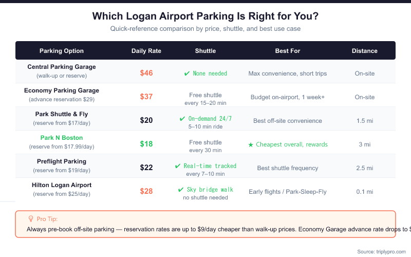 - Cheapest off-site option: Park N Boston at $18/day — free shuttle, ~8-minute ride to terminals