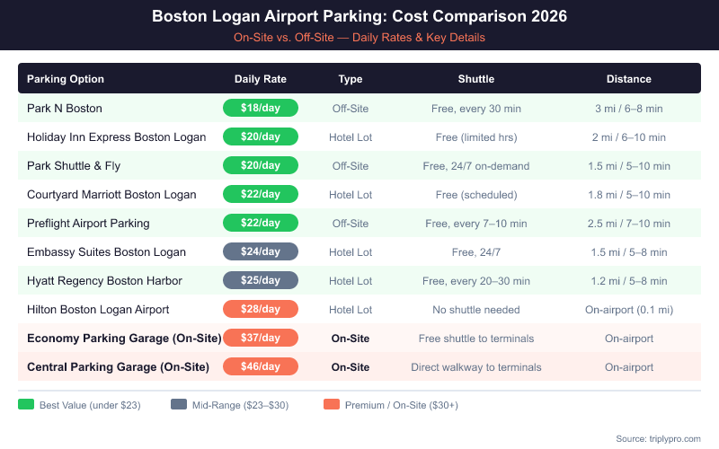 The cheapest way to park at Logan Airport is to book an off-site lot in advance. Park N Boston starts at $18/day — the lowest verified rate among named BOS parking facilities as of April 2026.