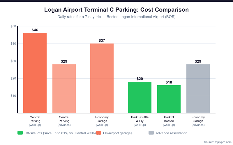 For cheap parking, the Economy Parking Garage at $37/day is the lowest on-airport rate. Off-site lots are cheaper still — Park N Boston at $18/day is currently the lowest verified rate near Logan. That's a 61% saving versus the Central Garage walk-up rate.