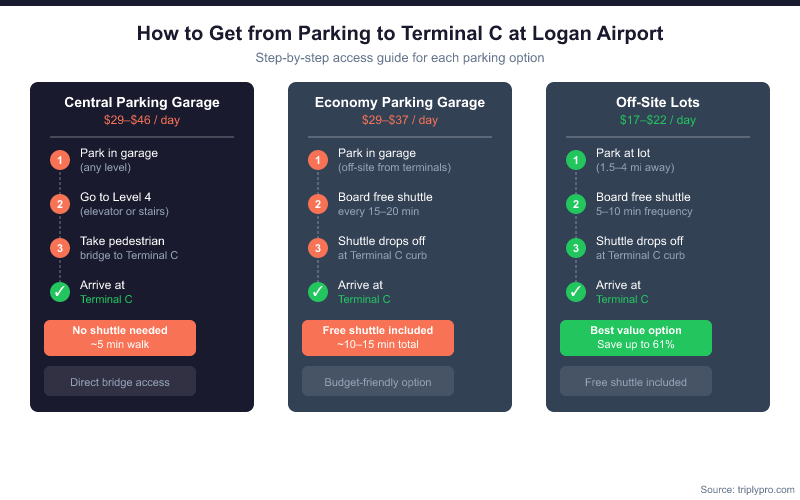 Logan Airport Terminal C parking is served by the Central Parking Garage as the closest on-airport option, with direct pedestrian bridge access from Level 4 to Terminal C. The Economy Parking Garage offers a cheaper alternative at $37/day, with a free shuttle running every 15–20 minutes to Terminal C. Off-site lots start as low as $18/day with free shuttles to all terminals. Most travelers flying JetBlue, Aer Lingus, or Etihad out of Terminal C can save significantly by booking off-site in advance.
