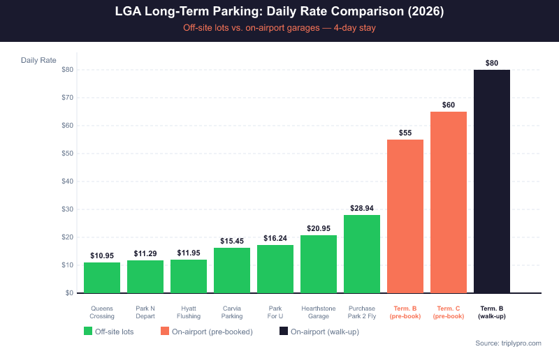 For a full breakdown of how these rates stack up across every scenario, our LaGuardia airport parking cost guide covers on-site vs off-site pricing in detail, including what a 1-week stay actually costs at each option.