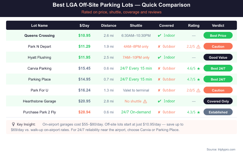 - Queens Crossing - LAZ Parking — $10.95/day: Covered indoor valet garage. Shuttle runs hourly 6:30 AM–10:30 PM. Best for travelers with daytime flights. Located in Flushing, 20–30 minutes from LGA.