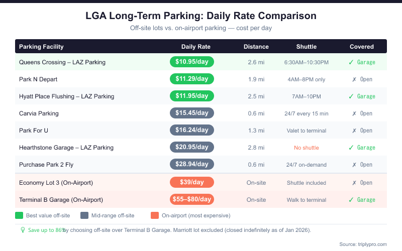 Ready to compare your options now? Compare LGA long-term parking rates from $10.95/day on Triply — filter by shuttle hours, covered parking, and distance from your terminal.