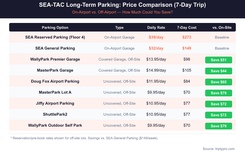 For a 7-day trip, parking at Jiffy Airport Parking or ShuttlePark2 saves you roughly $58 compared to SEA's General Parking rate of $149/week. Against the on-site Reserved rate of $273/week, the savings reach over $180 for a single week. Based on current Triply rates, off-airport lots deliver consistent savings of 40–60% versus on-airport pricing.