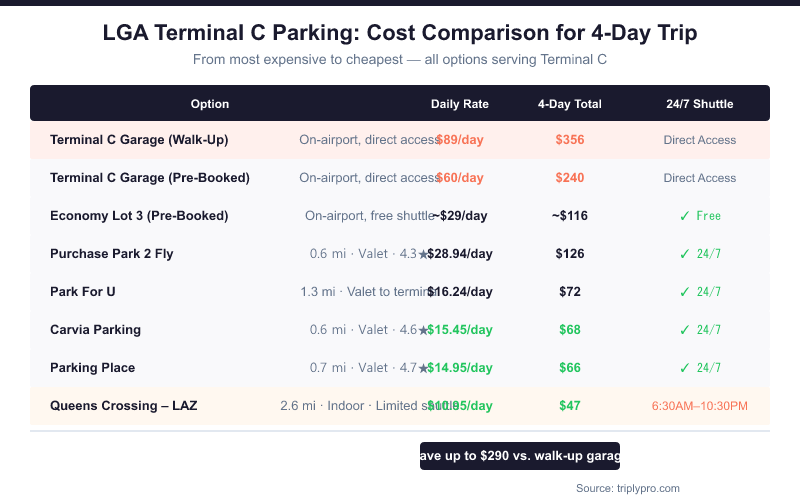 - Pre-booking always saves money — walk-up rates at the Terminal C Garage are among the highest at LGA