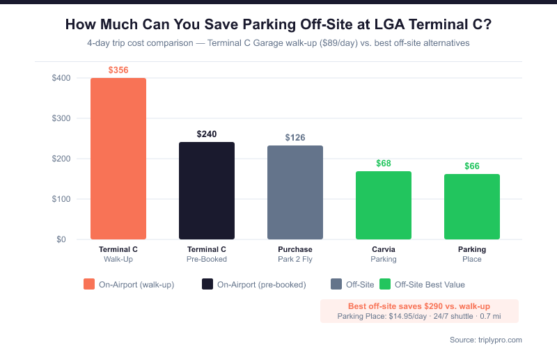 Long-term parking at LaGuardia Terminal C does not have to cost $89 a day. Off-site lots near Terminal C start at $10.95/day — that is a potential saving of over $540 on a 7-day trip versus the Terminal C Garage walk-up rate. Even the on-airport Economy Lot 3 saves you significantly over parking right at Terminal C.