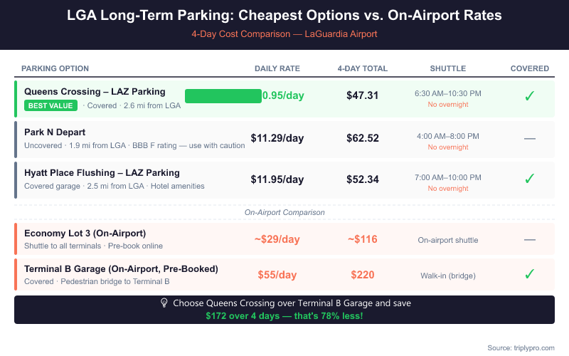 For the full breakdown of on-airport rates, the LaGuardia Airport long term parking price guide covers every tier in detail.