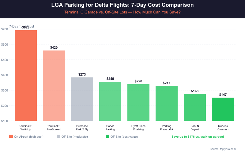 Long-term parking at LGA for Delta passengers ranges from $10.95/day at off-site lots to $89/day at the Terminal C Garage walk-up rate. Pre-booking always saves money, and off-site lots can cut your total parking cost by more than $300 on a 7-day trip. All verified lots on Triply offer free cancellation — so there's no downside to reserving early.