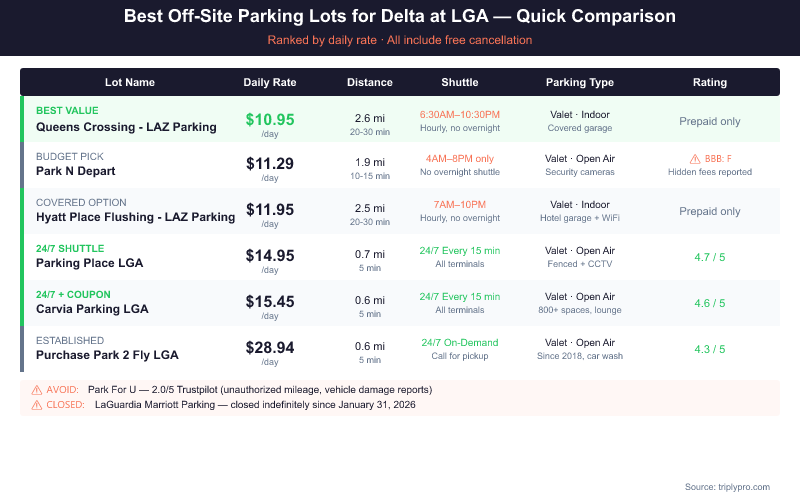 - Compare rates on Triply — search all verified LGA lots side by side at triplypro.com/search?airport=LGA.