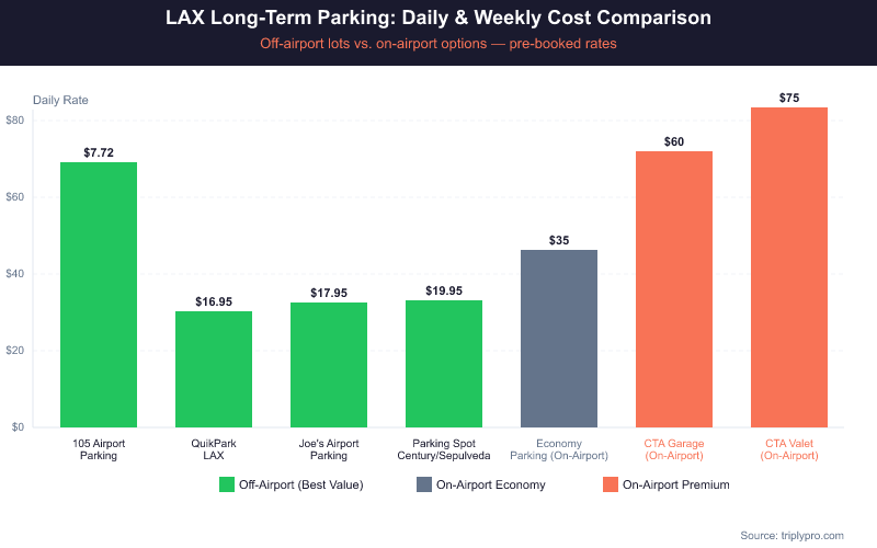 Daily rates for long-term parking near LAX range from $7.72/day (105 Airport Parking) to $60/day (CTA terminal garages). For a week-long trip, that spread becomes very significant.
