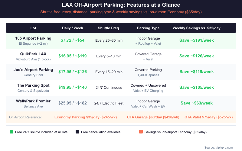 Off-site lots near LAX offer some of the best value in the country for multi-day parking. Rates range from $7.72/day at 105 Airport Parking to $31.95/day at WallyPark Express, and every verified lot includes a free 24/7 shuttle to all terminals. For a 7-day trip, that's a potential saving of over $190 compared to parking in the on-airport CTA garages at $60/day (verified April 2026).