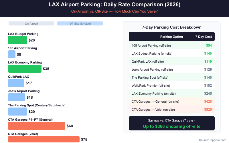 The gap between on-airport and off-site parking is striking. Choosing 105 Airport Parking at $7.72/day instead of a CTA garage at $60/day saves you over $52 per day — that's more than $360 saved on a one-week trip. For a detailed breakdown of every rate tier, see our guide to LAX airport parking prices.