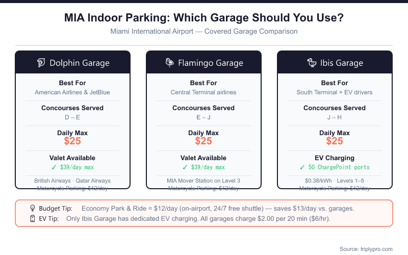 Miami Airport indoor parking means covered, multi-level garages at MIA — Dolphin, Flamingo, and Ibis — at $25/day. Here's how rates, locations, and off-site covered alternatives compare.
