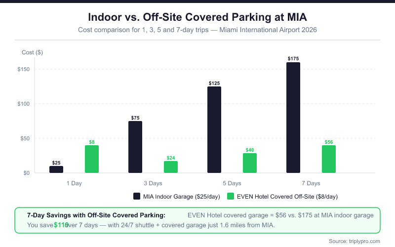For a single overnight stay, the on-airport garages cost $25. Over a 5-day trip, that adds up to $125. The EVEN Hotel Miami Airport's covered garage, by contrast, runs just $7.99/day — saving you roughly $85 on a 5-day trip, or about 68% less than the on-site rate. If saving money matters more than walking distance to your gate, the off-site covered option is hard to beat.
