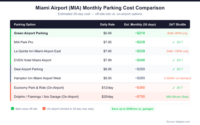 Ready to book? Compare Miami airport monthly parking rates starting at $6.99/day on Triply — filter by shuttle hours, covered parking, and distance to find the best MIA lot for your full stay.