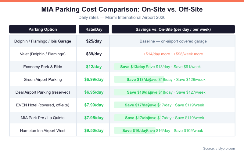 Cheap Miami airport parking is available at six verified off-site lots starting at $6.99/day — compared to $25/day at the on-site Dolphin, Flamingo, and Ibis garages. The best strategy is to book an off-site lot in advance, lock in a low rate, and use the free shuttle to reach your terminal. Most travelers save $50–$90 on a week-long trip by skipping the on-site garages entirely.