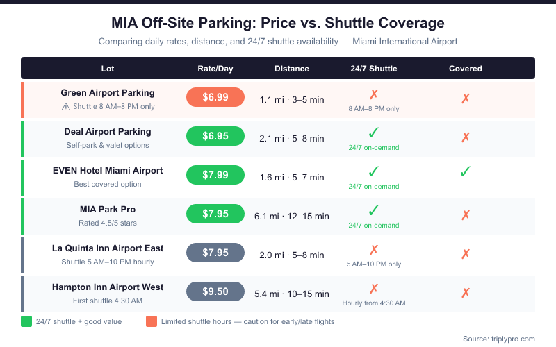 - Cheapest off-site lot: Green Airport Parking (MIA) at $6.99/day — but the shuttle only runs 8 AM–8 PM