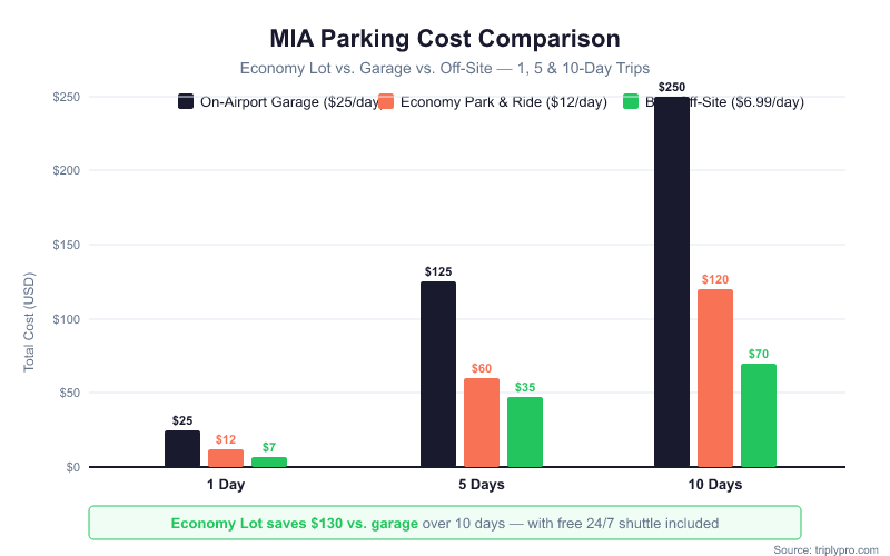 For extended trips of a week or more, off-site lots are hard to beat. A 7-day stay at MIA Park Pro ($7.95/day) costs $55.65 vs. $84 at the economy lot — a savings of nearly $30. For longer trips, our guide on Miami airport extended parking covers strategies specific to week-long and multi-week stays.