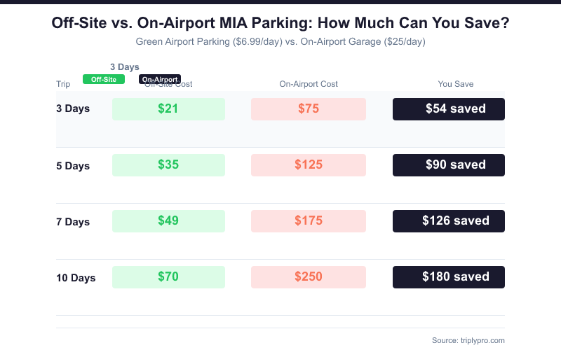 - Price range: Off-site lots near MIA run $6.99–$9.50/day (verified April 2026), versus $25/day on-airport.