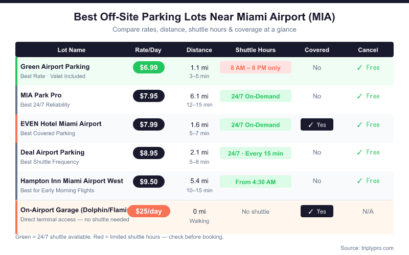Based on current verified rates, shuttle availability, and amenities, these are the six confirmed off-site parking lots near MIA (April 2026). Each has distinct strengths — the best choice depends on your flight time, budget, and whether you need covered parking.
