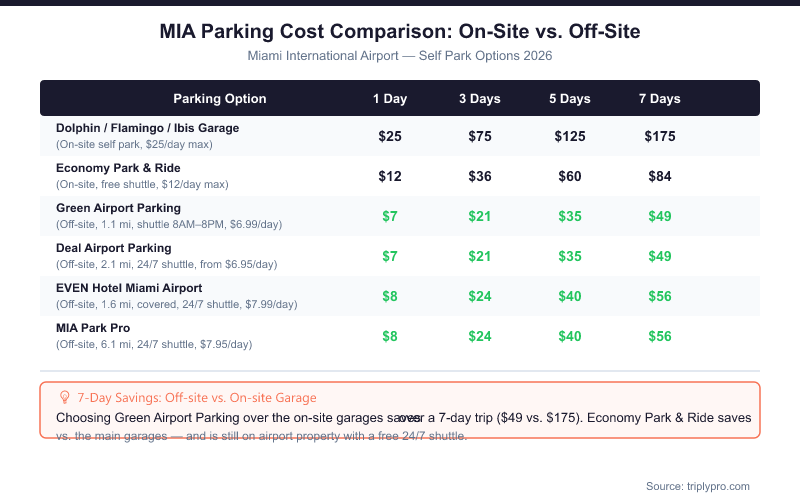 For a 7-day trip, parking at Green Airport Parking instead of the Dolphin Garage saves you over $126 — that's more than 72% off. Even the Economy Park & Ride saves 52% vs the standard garages over the same period. For a full breakdown of MIA parking rate tiers, see our complete 2026 MIA parking rates guide.