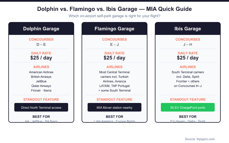 - Garage choice matters: Dolphin serves Concourses D–E; Flamingo serves Concourses E–J; Ibis serves Concourses J–H.