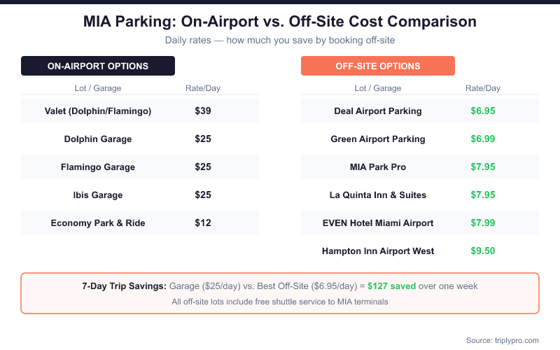 Off-site lots offer significantly lower rates. Based on current Triply data, the six verified MIA off-site lots range from $6.99 to $9.50 per day — saving travelers up to 72% compared to on-site garages. Here's a full comparison: