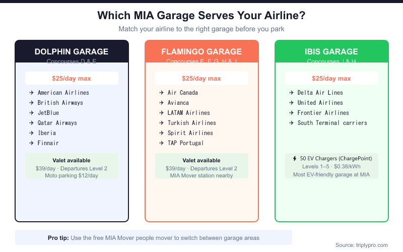 The right garage depends almost entirely on your airline and concourse. Using the wrong garage adds unnecessary walking — and at a large airport like MIA, that matters.
