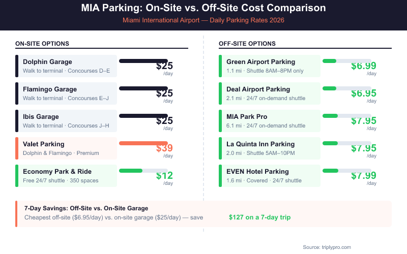 Miami International Airport parking costs $12–$25/day on-site and from $6.99/day off-site. Compare MIA garages, the Economy Lot, valet, and off-site options to find the best rate for your trip.