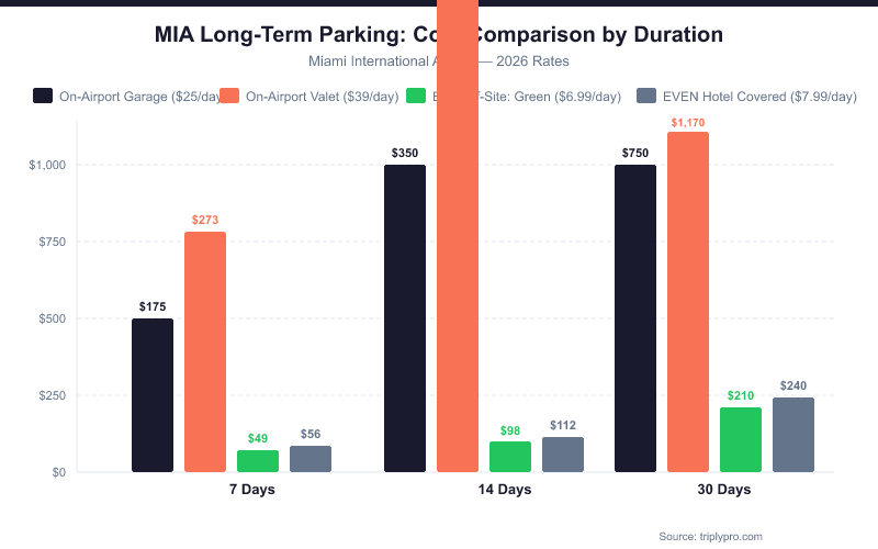 Miami long term parking rates range from $6.99/day off-site to $25/day on-airport. Compare all MIA lots, weekly cost breakdowns, and shuttle details to find your best deal.