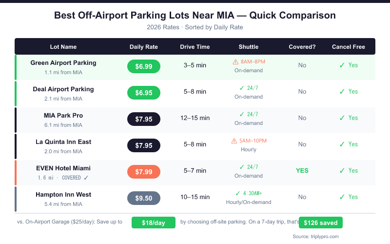 - Best 24/7 shuttle + low price: MIA Park Pro at $7.95/day with a 24/7 on-demand shuttle — though it's 12–15 minutes from the airport.