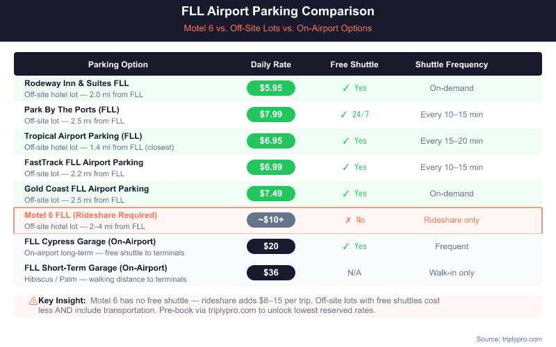 Here's how Motel 6 parking stacks up against verified FLL off-site lots and on-airport options (verified April 2026):