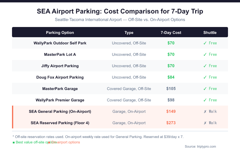 - On-airport comparison: SEA's official General Parking costs $32/day — a multi-day park-and-stay package can cut that significantly.