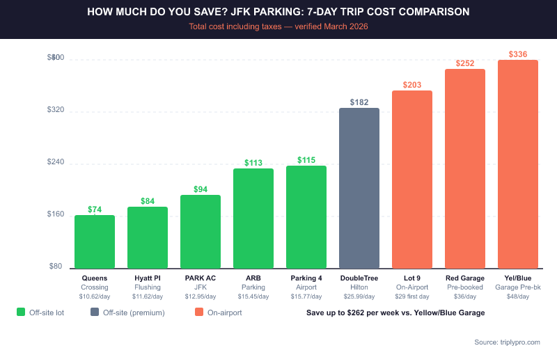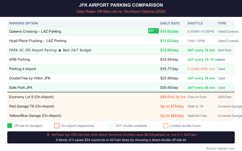 Here's a full comparison of current rates, based on JFK's official parking page and verified lot listings (verified March 2026):