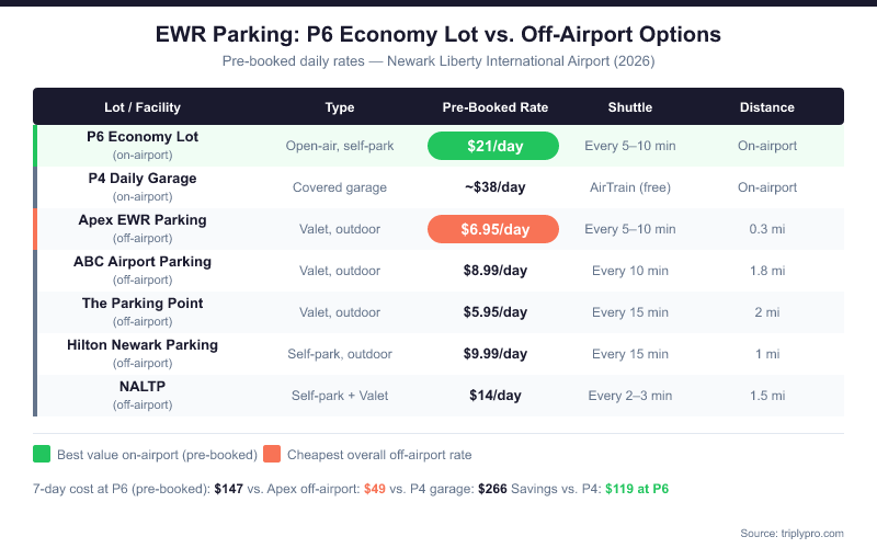 - Cheapest alternative: Off-site lots like Apex EWR Airport Parking start at $8.95/day — less than half the pre-booked P6 rate