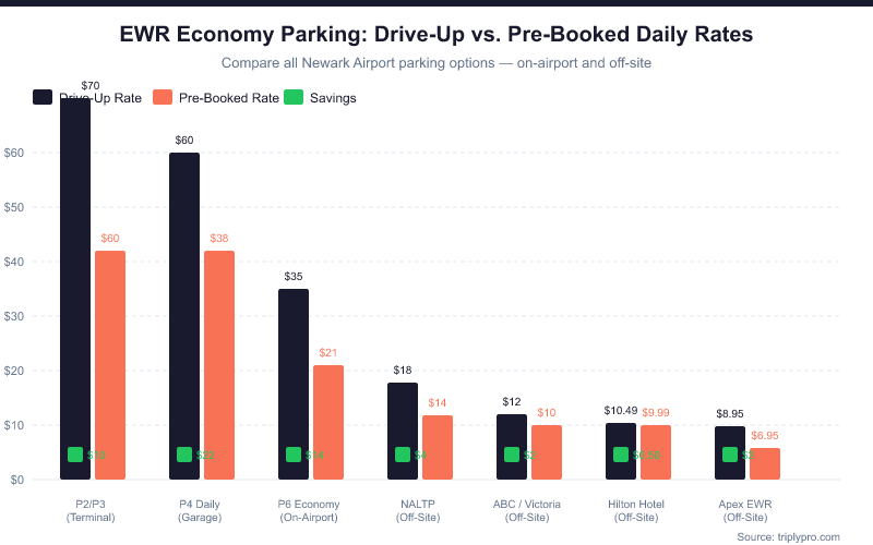- Off-site lots start at $8.95/day (Apex EWR Airport Parking), undercutting P6 by more than half.