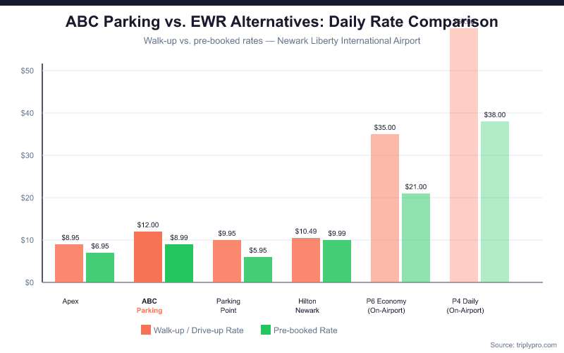 Ready to lock in a spot? Compare EWR off-site parking rates from $8.95/day on Triply — including ABC Airport Parking and 7 other nearby lots.