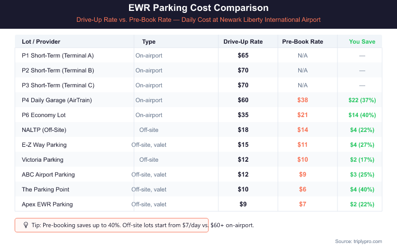 EWR parking fills fast around major holidays and in summer. The combination of pre-booking and a comparison search typically saves travelers $15-$40 per trip compared to showing up without a reservation.