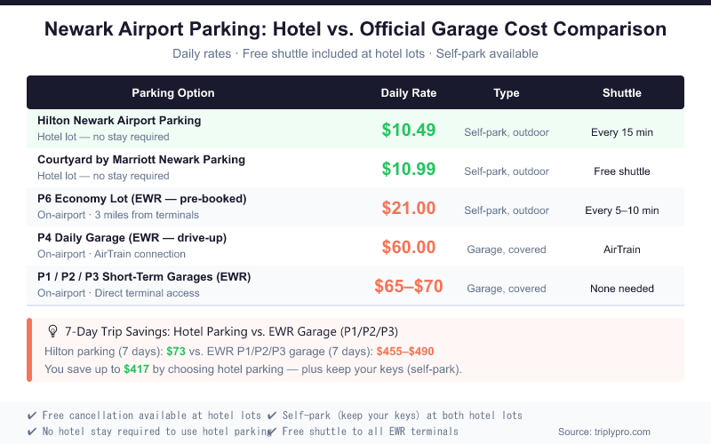 - Best budget hotel parking: Hilton Newark Airport Parking starts at $10.49/day with free shuttle every 15 minutes (verified April 2026).
