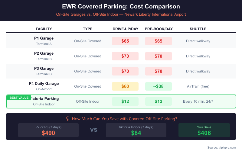 Covered parking at EWR ranges from $12/day at Victoria Parking to $70/day at P2 or P3 drive-up. The right choice depends on your terminal, trip length, and whether the convenience of a direct walkway is worth the premium. Pre-booking P4 is the smartest move for covered on-site parking — you get a multi-level garage with AirTrain access and EV charging for around $38/day. For the absolute lowest covered rate, Victoria Parking at $12/day with a free 10-minute shuttle is hard to beat.
