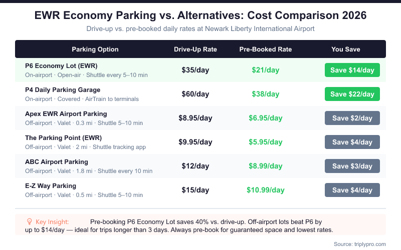 - Off-site lots beat P6 on price — Apex EWR Airport Parking starts at $8.95/day with direct terminal shuttles.