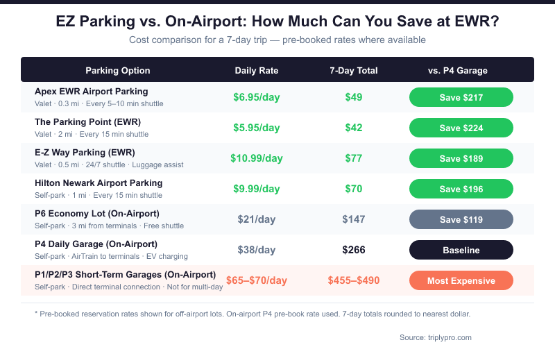 At $15/day, E-Z Way Parking saves you up to $55/day versus on-airport Terminal B or C parking. For a 7-day trip, that's a potential savings of over $385 compared to parking in P2 or P3. The lot also includes free valet service — no charge on top of the daily rate. If you want to compare live rates across all EWR lots for your exact travel dates, compare EWR parking options starting at $8.95/day on Triply.