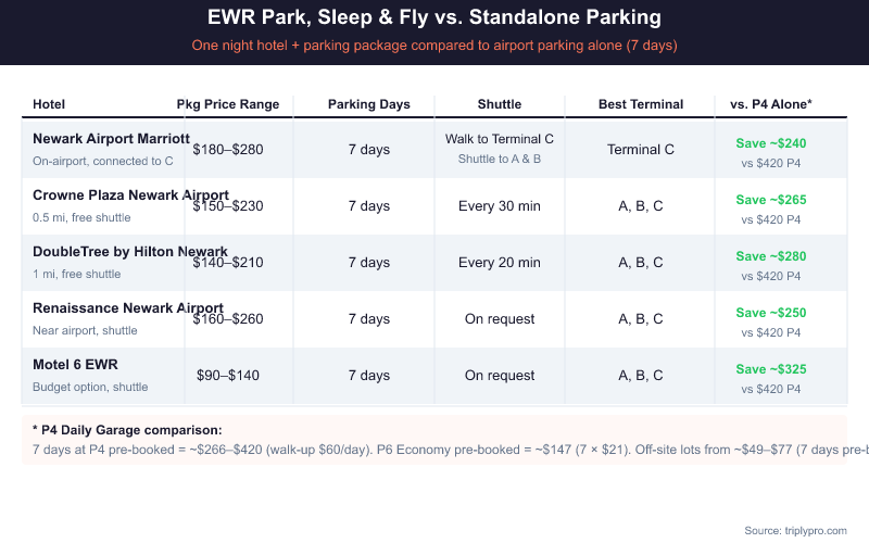 - Savings potential is real: On-airport lots at EWR charge up to $70/day. A hotel package with 7 days of free parking can cut that cost dramatically.