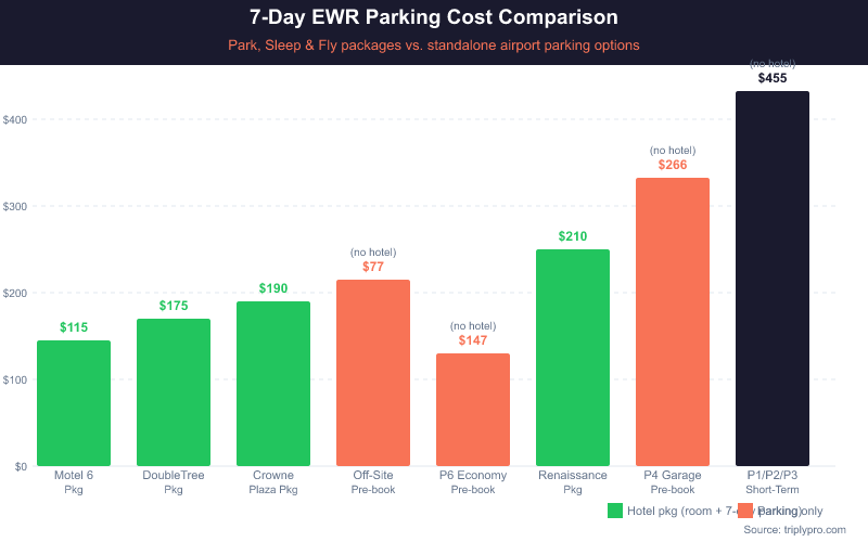 For context: on-airport parking at EWR's P1, P2, and P3 lots runs up to $65–$70/day at drive-up rates, per the Port Authority of New York and New Jersey. A 7-day trip would cost $455–$490 in parking alone without pre-booking. Even a mid-range park-sleep-fly hotel package can undercut that total when you factor in the included parking days. For a full breakdown of on-airport rates, see our guide on Newark airport parking fees and the complete rate breakdown.